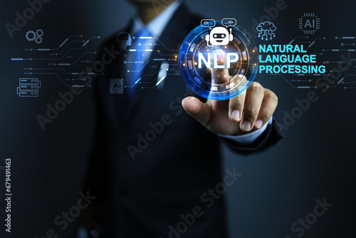 A businessman points his hand on NLP or natural language processing, showing the application of technology to business and adapting to the edge of digital and technology