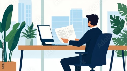 A businessman reading documents at a desk in a modern office with plants and city view.