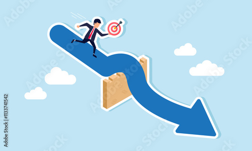 A businessman runs with a target board, following an arrow through a wall, illustration of guidance in facing business problems according to business targets