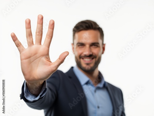 A Businessman Smiling and Showing His Hand With an Open Palm in a Professional Setting for a Friendly Greeting or Gesture