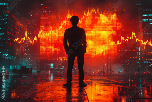 A businessman standing in front of a downward-trending stock chart, symbolizing the loss of wealth and value. Concept of business.
