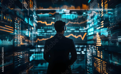 A businessman stands before a wall of dynamic data streams and financial charts, visualizing data and market trends.
