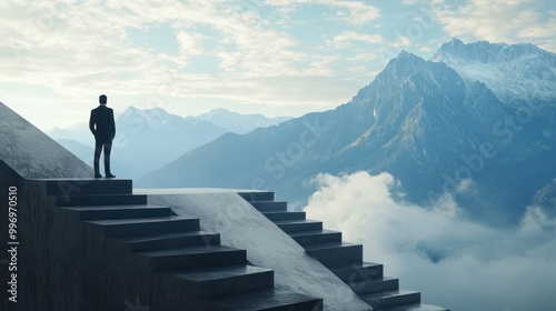 A businessman stands on the stairs. and beautiful mountains, success concept