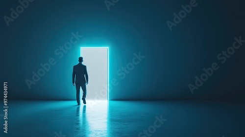 A businessman stepping into a glowing doorway of opportunity, symbolizing business growth and innovation.