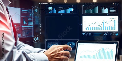 A businessman working on a digital tablet, with virtual interface screens showing graphs and data analysis, symbolizing digital transformation in business, screens, digitization