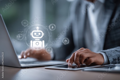 A businessman working with a laptop and digital tablet, focused on technology devices in an office setting.