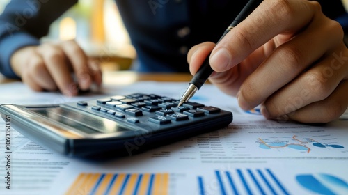 A businessman's hand using a calculator to calculate numbers on financial documents.