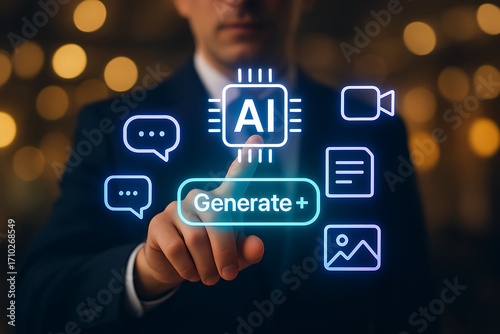 A businessperson uses artificial intelligence for generating a variety of digital content, from text and images to documents and videos