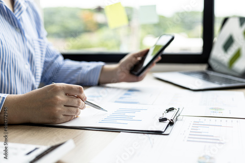 A businesswoman checking sales briefs and sending text messages to her via mobile phone, she is reviewing data and analyzing sales data to plan to manage more sales growth. Sales management concept.
