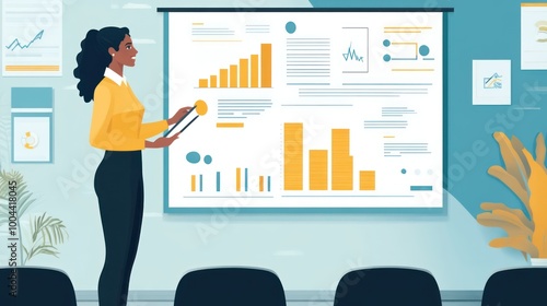 A businesswoman giving a presentation in a conference room, digital slides with growth charts and project timelines
