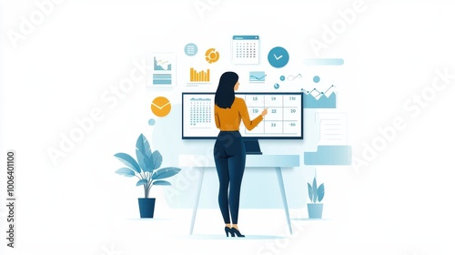 A businesswoman is standing in front of a large screen, setting monthly goals using a digital calendar tool in a modern office., flat design illustration