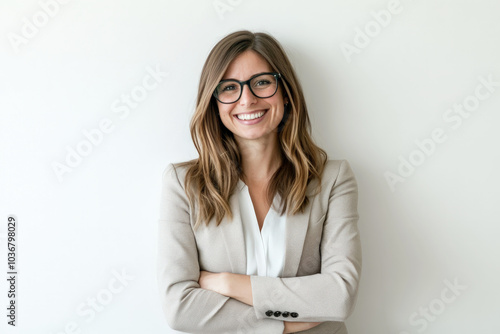 A businesswoman stood confidently against a white wall with her arms crossed, a bright smile on her face that radiated professionalism and approachability.