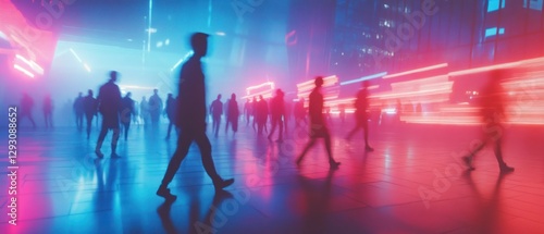 A bustling urban night scene with silhouettes of people walking through a neon-lit environment, showcasing vibrant lights and a dynamic atmosphere