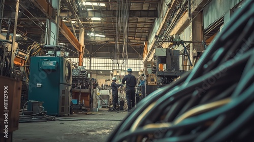 A busy industrial workshop showcasing equipment and workmen engaged in various manufacturing tasks within a spacious facility.