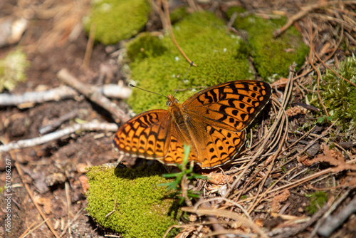A butterfly (atlantis fritillary) sunning itself in the wild.