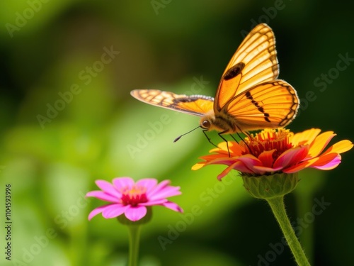 A butterfly's wings flutter rapidly as it feeds on a sweet-smelling flower in mid-air, flight, organic
