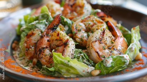 A Caesar salad elevated with the addition of grilled shrimp and a sprinkle of crunchy pine nuts on top of charred romaine lettuce.