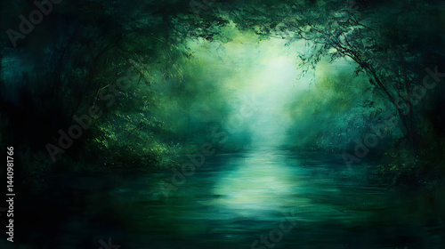 A calm and peaceful scene painted in soft shades of green and blue to symbolize growth, healing, and serenity.