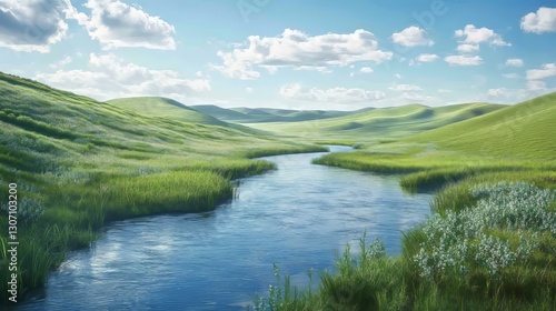 A calm river flowing through a green valley, surrounded by rolling hills, peaceful countryside atmosphere, ultra-detailed, high resolution.