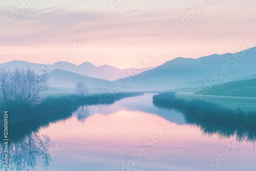 A calm river flows through the center with subtle reflections of the surrounding mountains