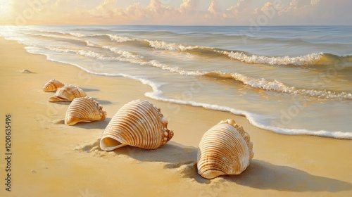 A calm shoreline with gentle ripples, golden sand, and vibrant seashells scattered about.