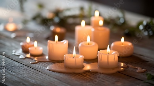 A calming scene of lit candles in various shapes on a rustic table, with flickering flames casting a warm glow and creating a serene atmosphere.