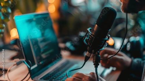 A candid image of a person recording a podcast, capturing the authentic and creative journey of content creation.