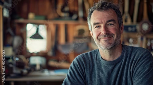 A candid portrait of a man in his 40s enjoying a hobby, reflecting personal interests and passions