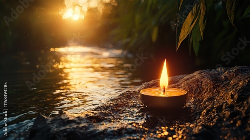A candle flickers on a rock by a serene stream at sunset, creating a tranquil atmosphere.