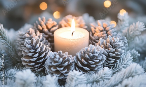 A candle is lit in a pine cone arrangement