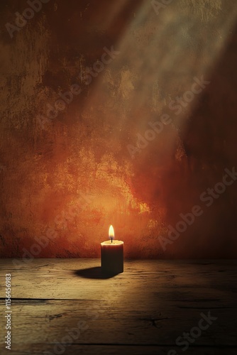 A candle is lit on a wooden table in front of a wall. The candle is the only source of light in the room