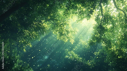 A canopy of vibrant leaves in shades of green, with sunlight filtering through, creating a peaceful atmosphere