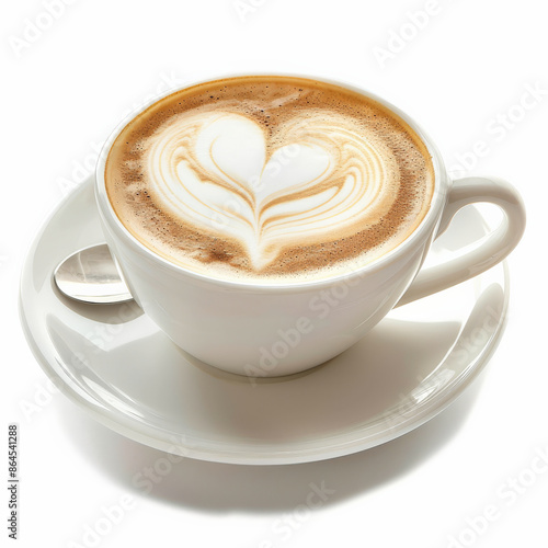 A cappuccino with a perfect foam art heart on top, isolated on white background