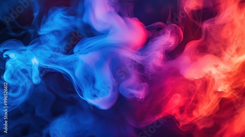 A captivating blend of blue and red smoke swirling in vibrant patterns against a dark background.