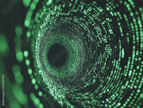 A captivating digital tunnel of glowing green dots creates a futuristic, abstract scene.