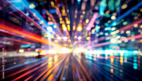 A captivating display of colorful lights illuminates the bustling city streets at night
