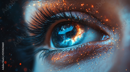 A captivating hyperrealistic eye formed by a nebula with swirling stars and distant galaxies within the iris, set against a dark cosmic background with a minimalistic bright tone and blurred space