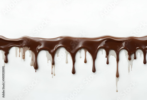 A captivating image of a row of chocolate flowing down a white wall. Perfect for food-related projects or advertisements,Isolated Chocolate Drip,melted chocolate dripping isolated on white background