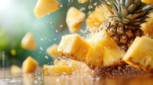 A captivating image of fresh pineapple chunks splashing in mid-air, showcasing the fruit's juicy texture and vibrant color explosion in vivid detail.