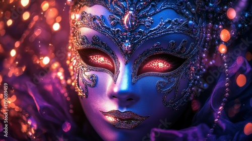 A captivating mask adorned with intricate designs and glowing eyes, set against a vibrant, colorful backdrop, evoking mystery and allure.