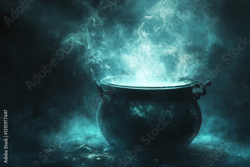 A captivating mystical cauldron emits enchanting smoke, creating a mysterious atmosphere. Perfect for conveying themes of magic, fantasy, and witchcraft.