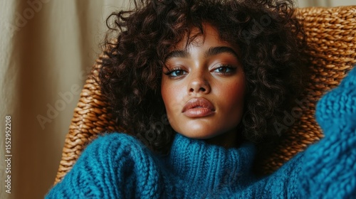 A captivating portrait of a beautiful woman in a cozy setting, emphasizing her striking features and the intimate aesthetic of her calm expression.