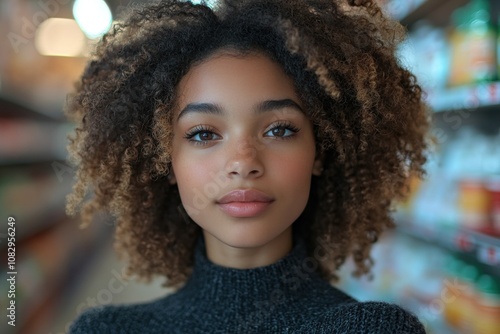 A captivating portrait of a confident young woman with natural curly hair, standing in an aisle of a grocery store, gracefully emanating warmth and charm