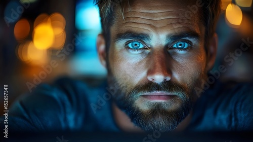 A captivating portrait of a man with striking blue eyes, bathed in soft light.