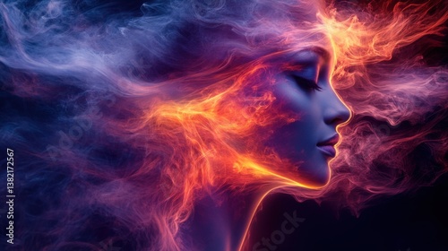 A captivating profile of a woman with flowing, colorful hair resembling flames, creating an ethereal and mystical atmosphere.