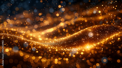 A captivating scene of glowing golden particles forming fluid, wave-like patterns against a dark backdrop.