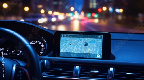 A car dashboard reveals a navigation system while driving through a city at night, surrounded by colorful bokeh lights.