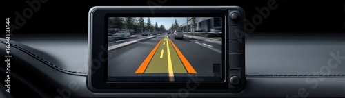 A car dashboard screen displays a navigation system with augmented reality lane guidance on a city road, Floating UI tablet inside car cockpit with a driving car on a road, AI-integrated car