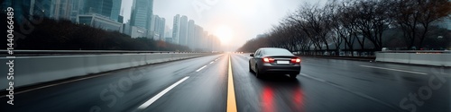 A car drives on a wet, empty highway through a modern city at sunrise, with buildings on one side and trees on the other.