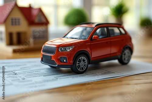 A car, in the background a house and documents, the concept of an insurance company. Generative AI